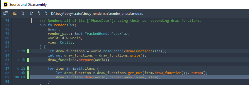 Let’s look at what RenderPhase<bevy_core_pipeline::core_3d::Opaque3d> is up to first. Click on it in the Call Graph, brings up the trusty source view again